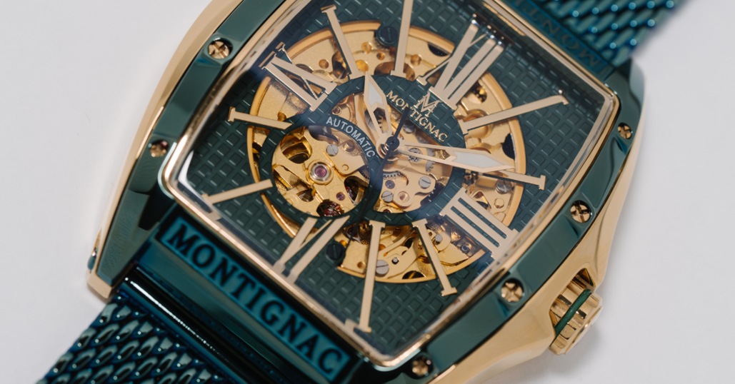 Designed and assembled in France, the MOW1102 men's watch embodies uniqueness and boldness. With its elegant tonneau shape, this green and gold model highlights the precision of its skeleton automatic movement, showcased through a dial adorned with Roman numerals.