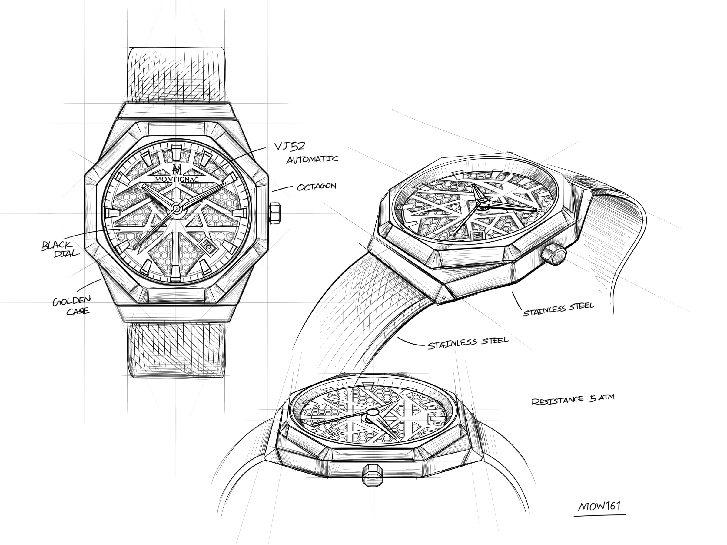 Dessinée et assemblée en France, la montre pour homme MOW161 présente un cadran nid d’abeilles noir rehaussé d’aiguilles dorées, rappellant la couleur de son boîtier octogonal. Ce modèle propose une fonction Date.