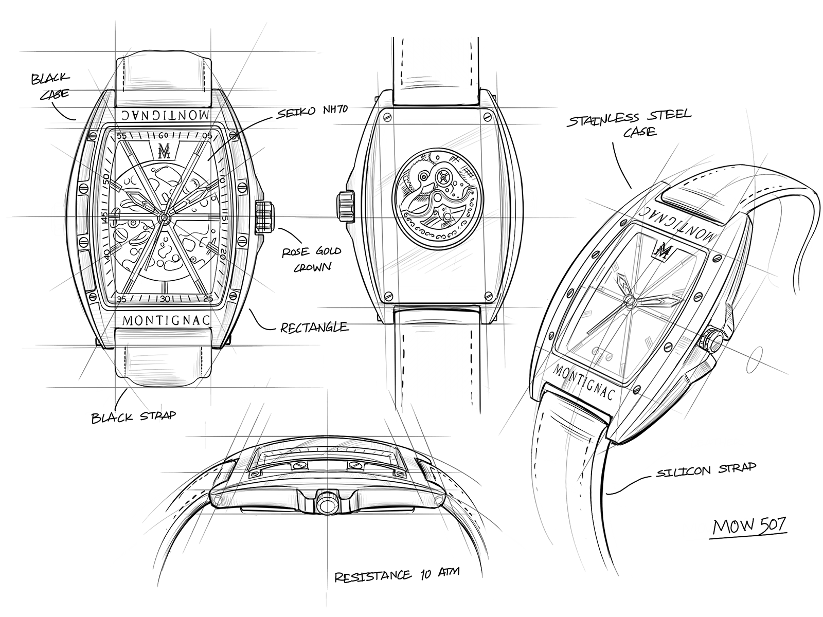Designed and assembled in France, the MOW507 men's watch offers the best of traditional watchmaking and contemporary design. With this powerful barrel-shaped creation, Montignac combines an ultra-comfortable and modern silicone strap with a Japanese automatic movement, meeting the expectations of the most demanding customers.