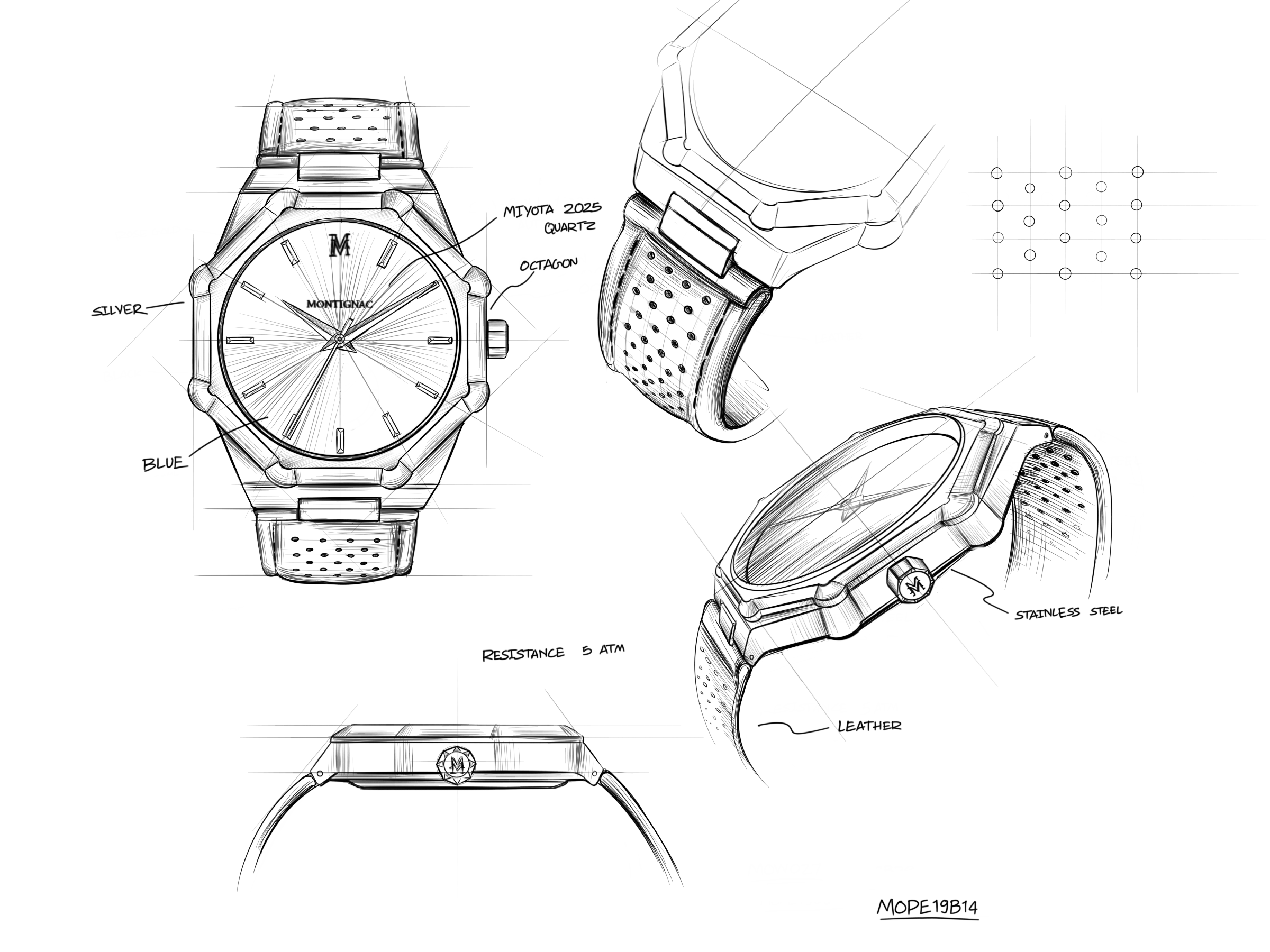 "Sentinel" désigne sentinelle, celle qui veille sans relâche. À Montignac, les tours octogonales dominaient les vallées pour surveiller à 360°. La collection SENTINEL incarne cette attention permanente. Son boîtier octogonal, symétrique et parfaitement équilibré, capte la lumière sur chacune de ses huit faces. La lunette est fine, les flancs légèrement inclinés, pour une lecture visuelle claire et technique. C'est une montre qui évoque l'analyse, la structure et le contrôle.
