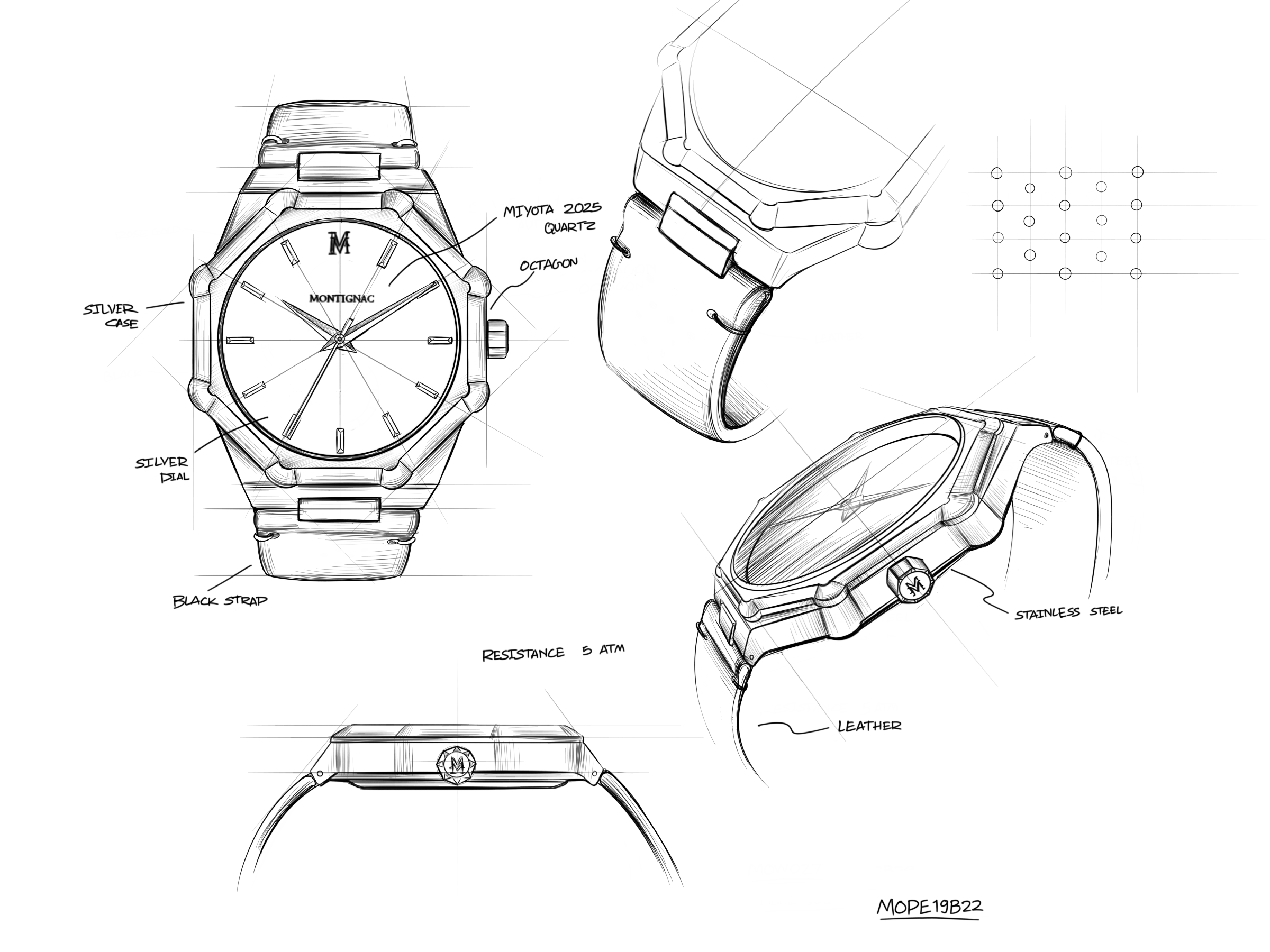 "Sentinel" désigne sentinelle, celle qui veille sans relâche. À Montignac, les tours octogonales dominaient les vallées pour surveiller à 360°. La collection SENTINEL incarne cette attention permanente. Son boîtier octogonal, symétrique et parfaitement équilibré, capte la lumière sur chacune de ses huit faces. La lunette est fine, les flancs légèrement inclinés, pour une lecture visuelle claire et technique. C'est une montre qui évoque l'analyse, la structure et le contrôle.