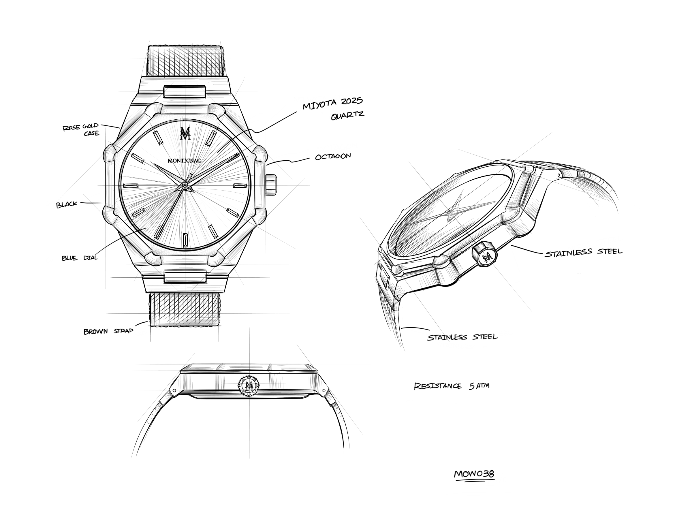 "Sentinel" désigne sentinelle, celle qui veille sans relâche. À Montignac, les tours octogonales dominaient les vallées pour surveiller à 360°. La collection SENTINEL incarne cette attention permanente. Son boîtier octogonal, symétrique et parfaitement équilibré, capte la lumière sur chacune de ses huit faces. La lunette est fine, les flancs légèrement inclinés, pour une lecture visuelle claire et technique. C'est une montre qui évoque l'analyse, la structure et le contrôle.