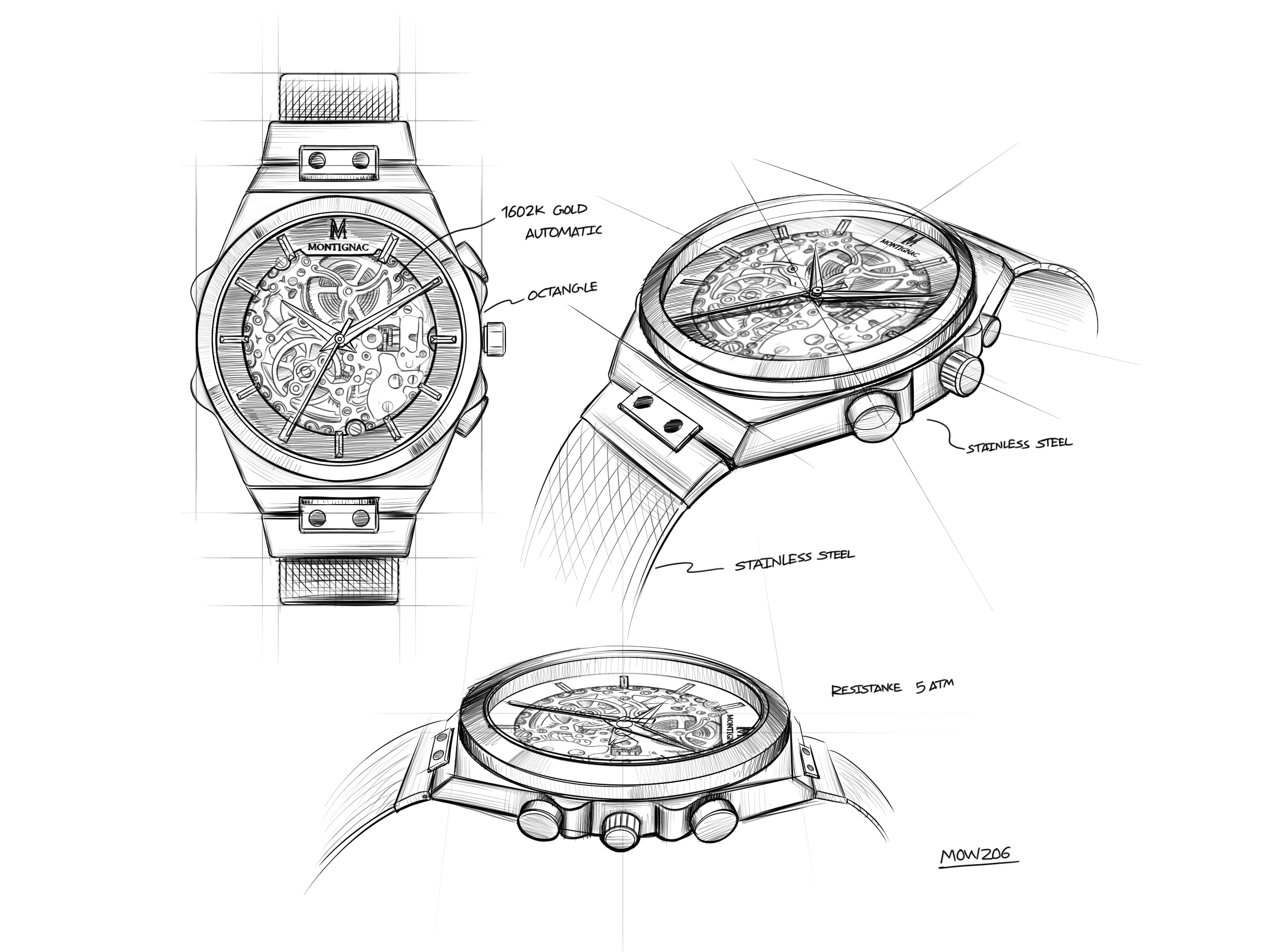 Montignac réinvente la montre automatique de luxe squelette avec un boîtier en acier qui associe l’or et le noir, dans une combinaison de métal portée sur un bracelet en cuir qui confère à cette création extra plate une élégance masculine authentique.
