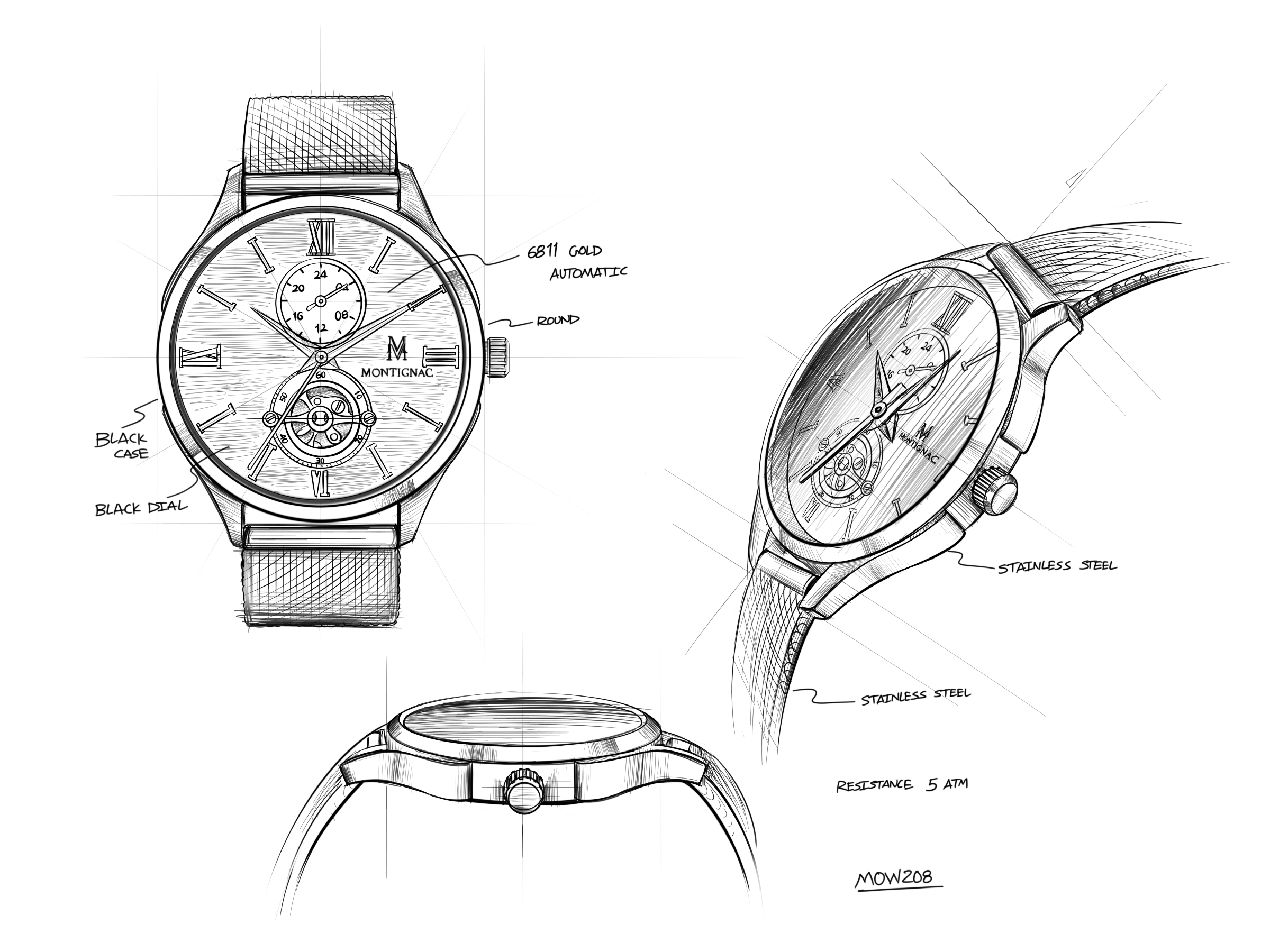 Fonctions : 3 aiguilles (heures, minutes, secondes), 24 heures, cœur ouvert