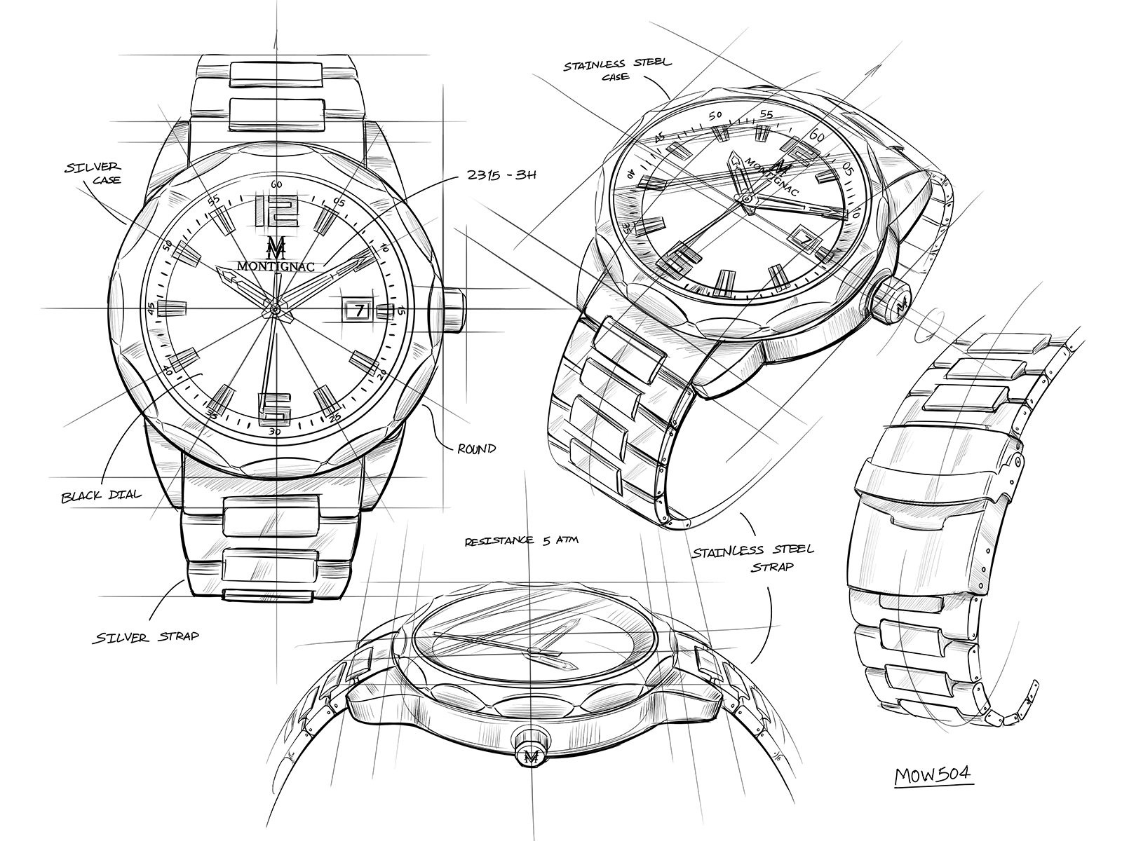 Fonctions : 3 aiguilles (heures, minutes, secondes), date